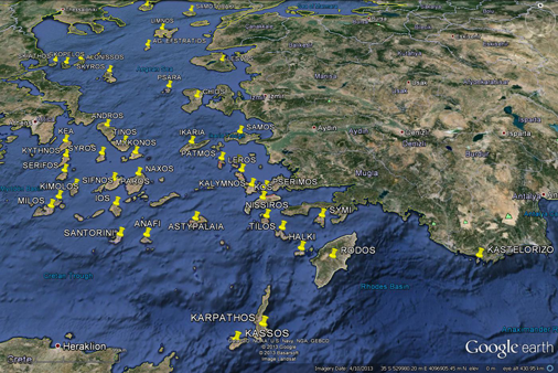 Δίκτυο νήσων Αιγαίου Πελάγους που περιλαμβάνονται στη βάση δεδομένων καταγραφής παραλιών